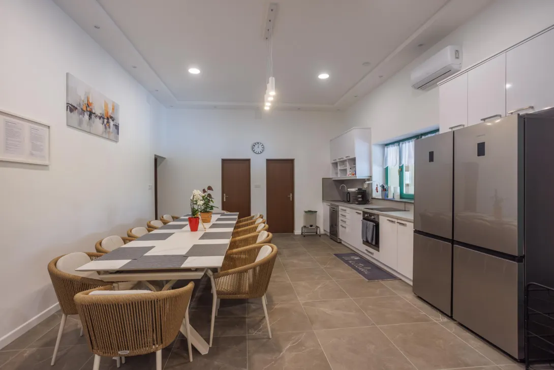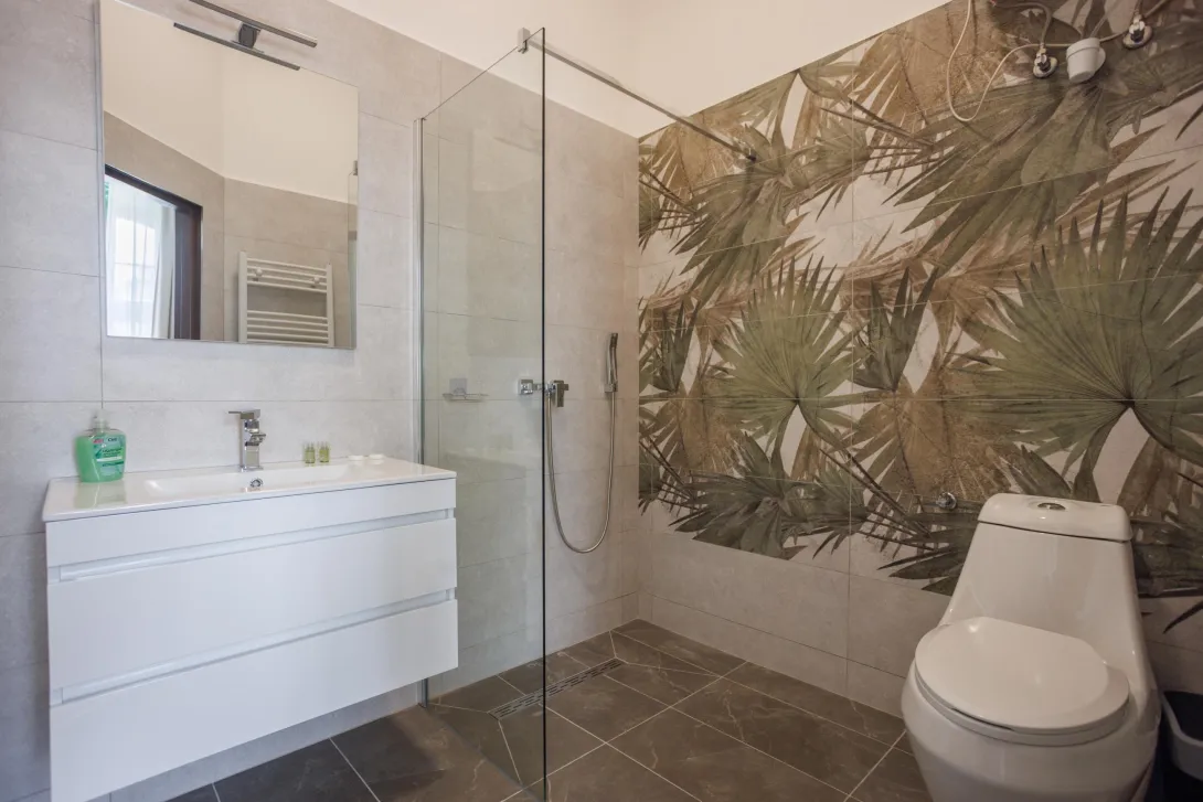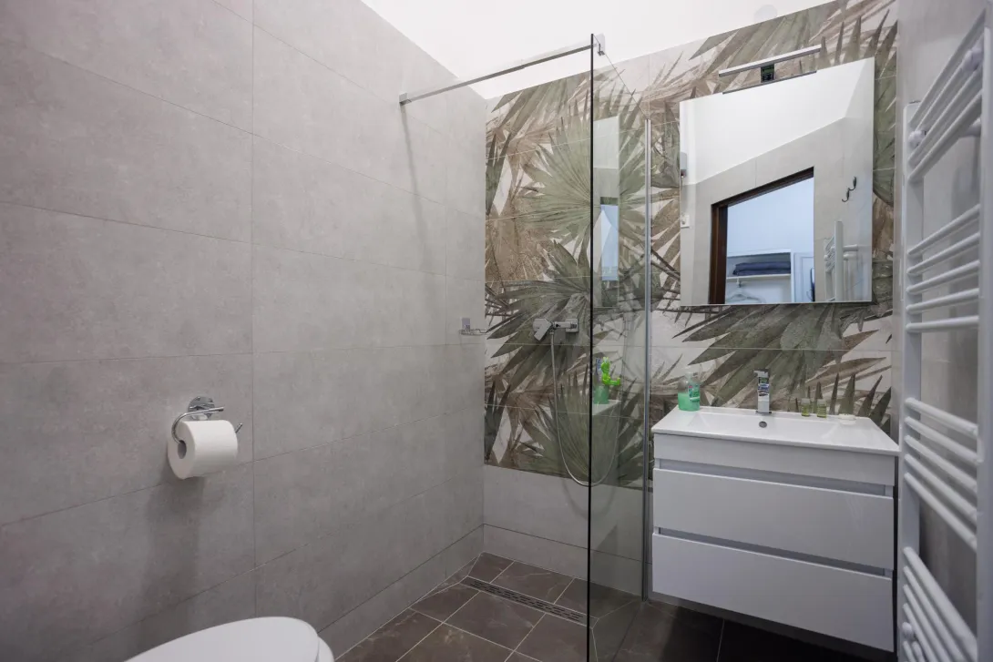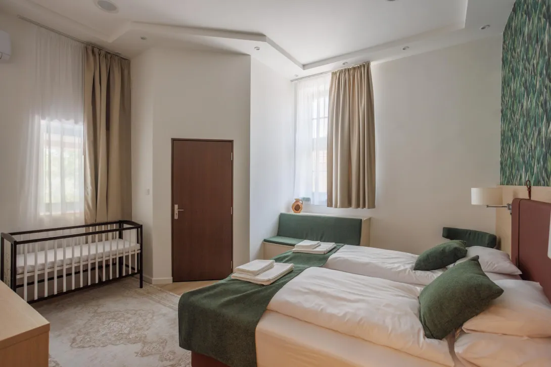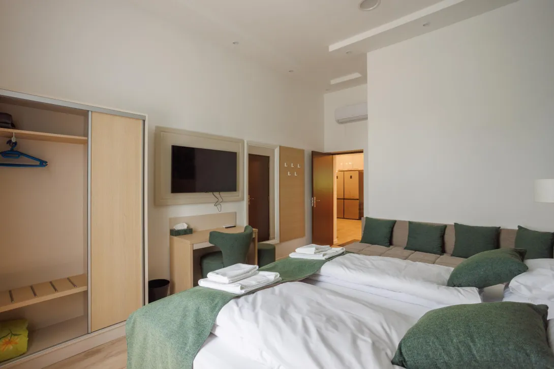 - 1. szoba: Franciaággyá alakított boxspring ágy + Wc + Zuhanyzó