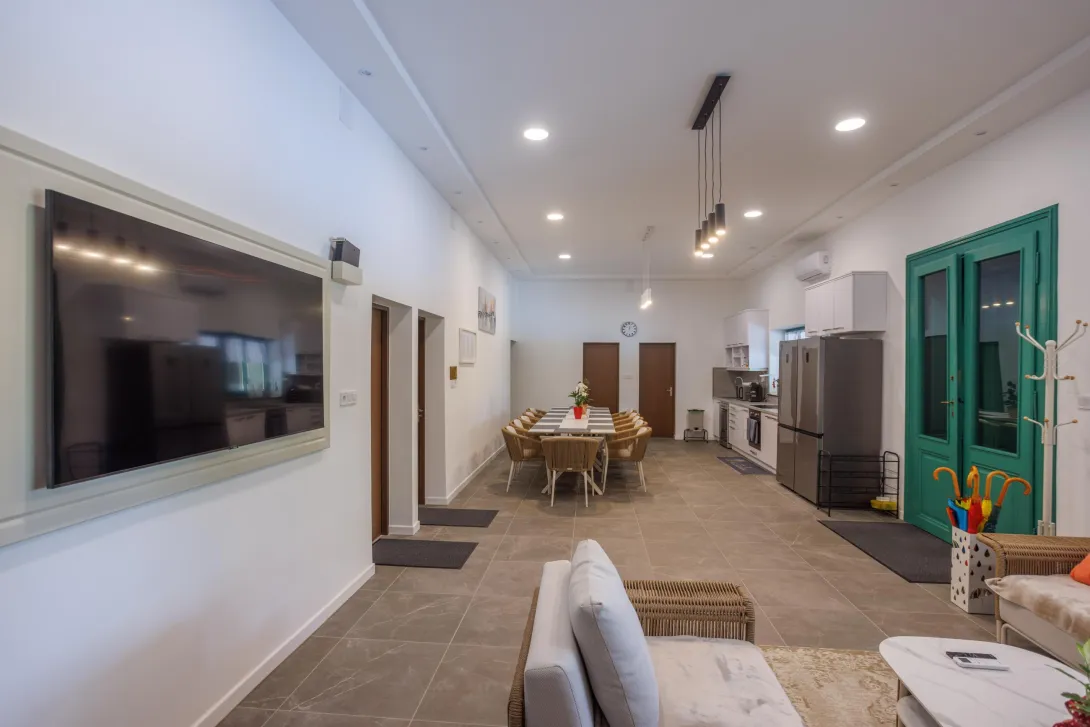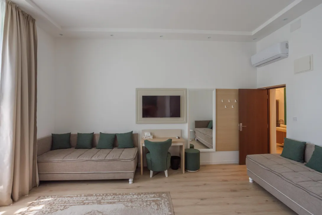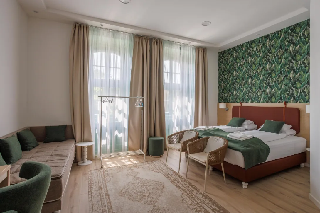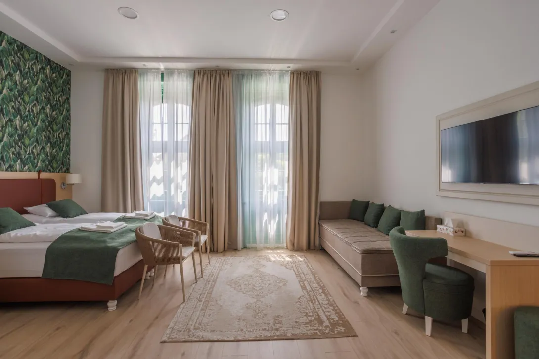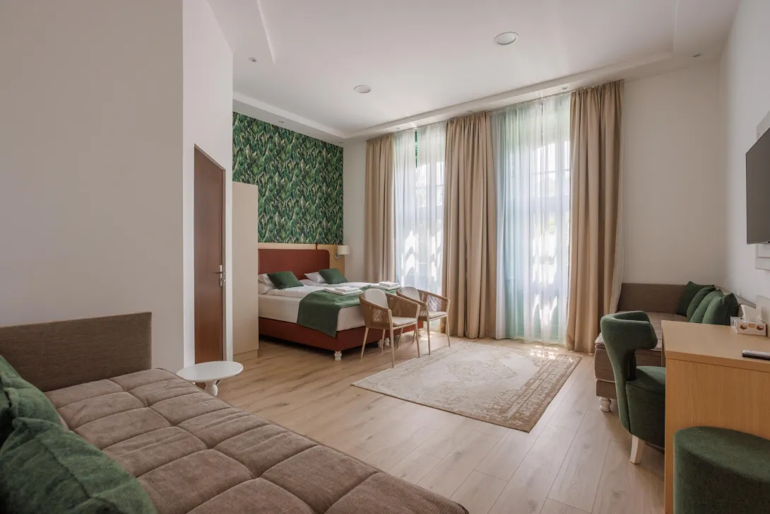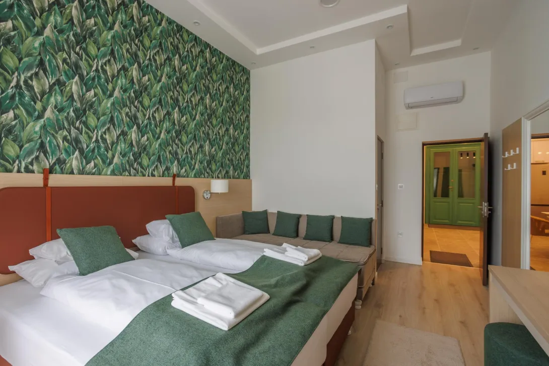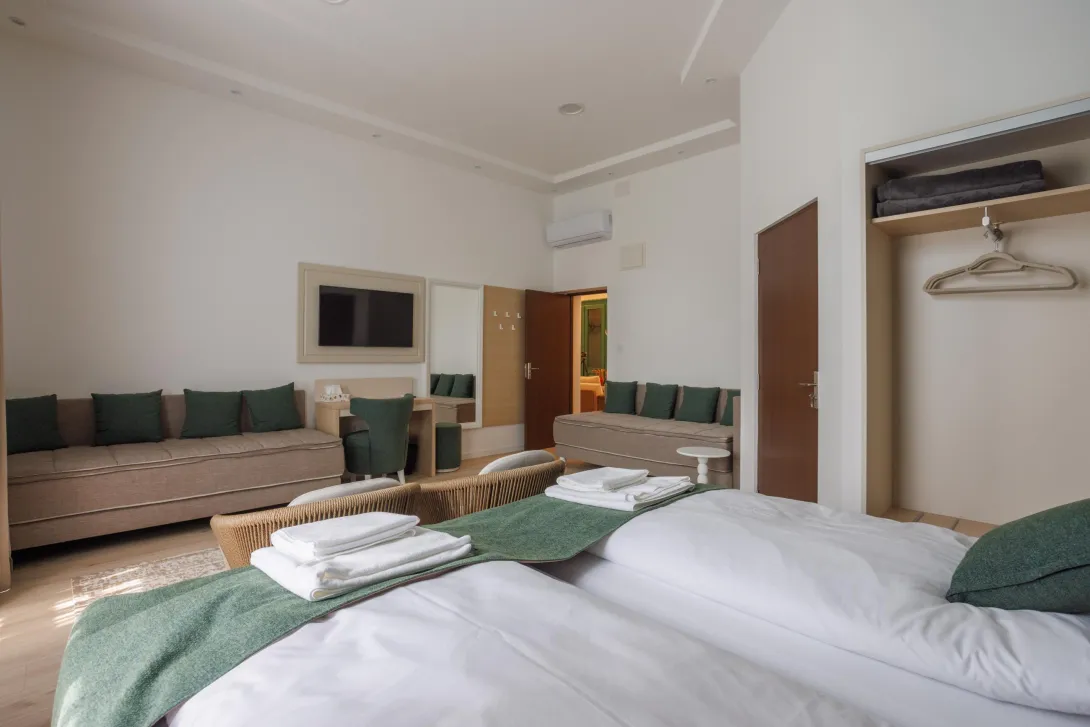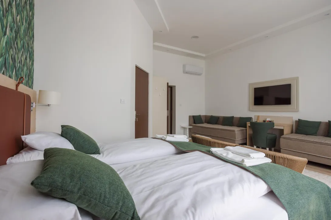 - 5. szoba Franciaággyá alakított alakított boxspring ágy + 2 db lounge mely napközben pihenésre szolgál vagy ágyként funkcionál + Wc + Zuhanyzó